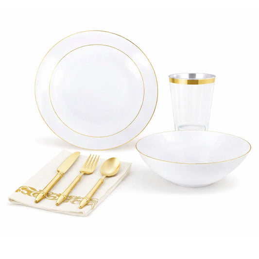 White With Gold Rim Plastic Dinnerware Set- Value Pack-Organic