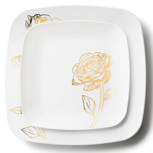 COMBO SET Peony 10.25" & 7.25" White and Gold Square Plastic Dinnerware Set