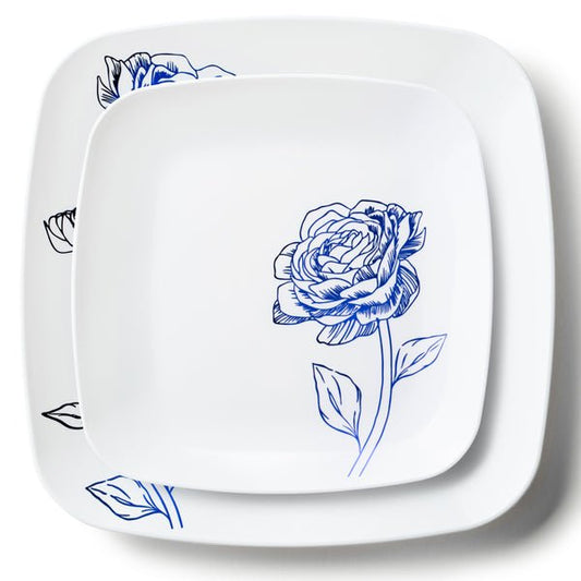 COMBO SET Peony 10.25" & 7.25" White and Blue Square Plastic Dinnerware Set