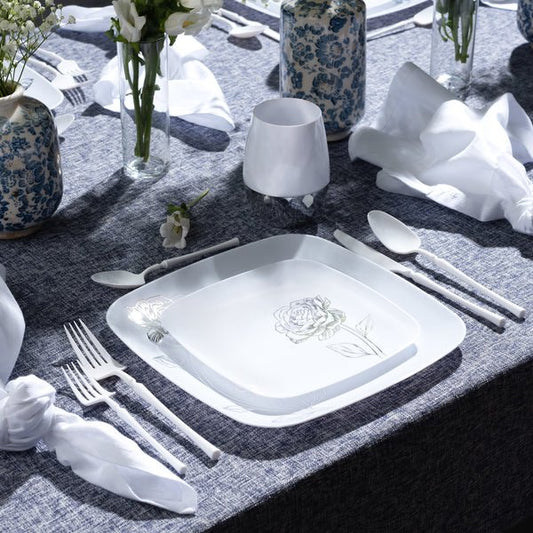 10.25"&7.25" White and Silver Square Disposable Plastic Plates COMBO Set-Peony