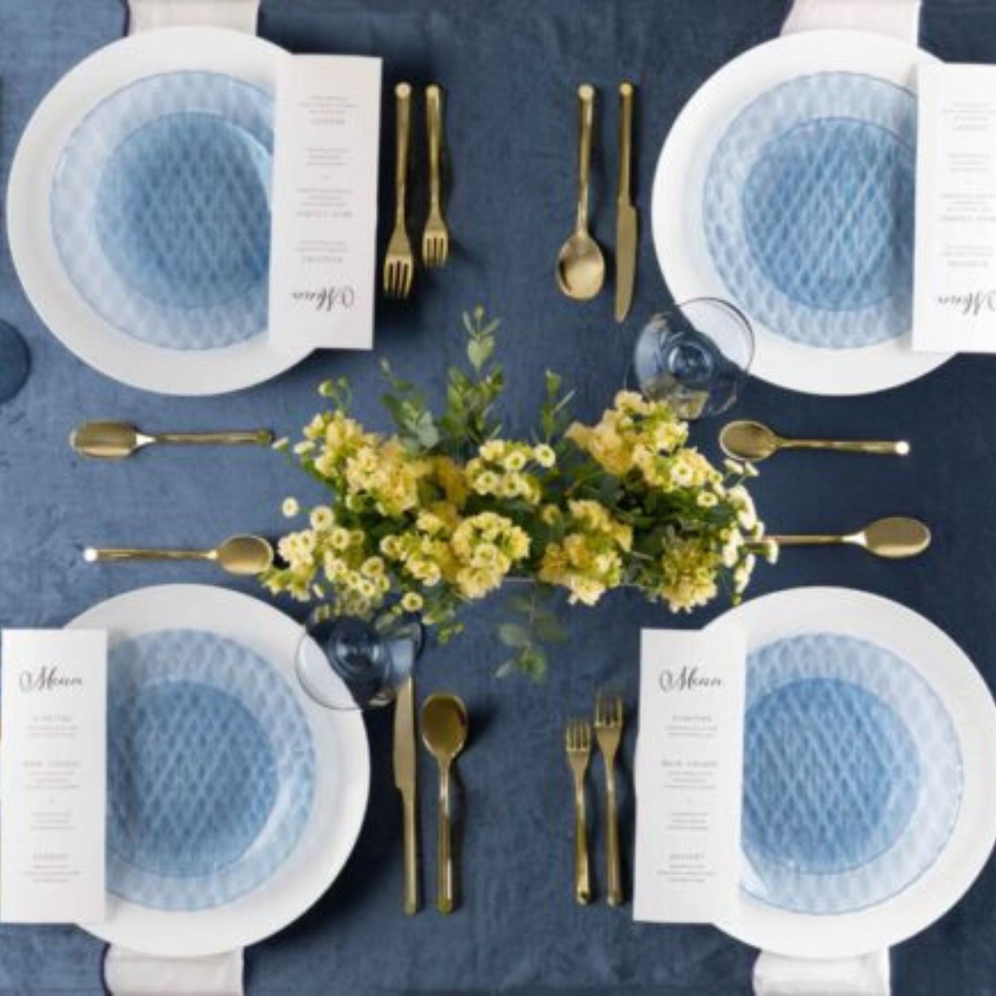 Beautiful blue plates with textured pattern create a refined and upscale presentation.