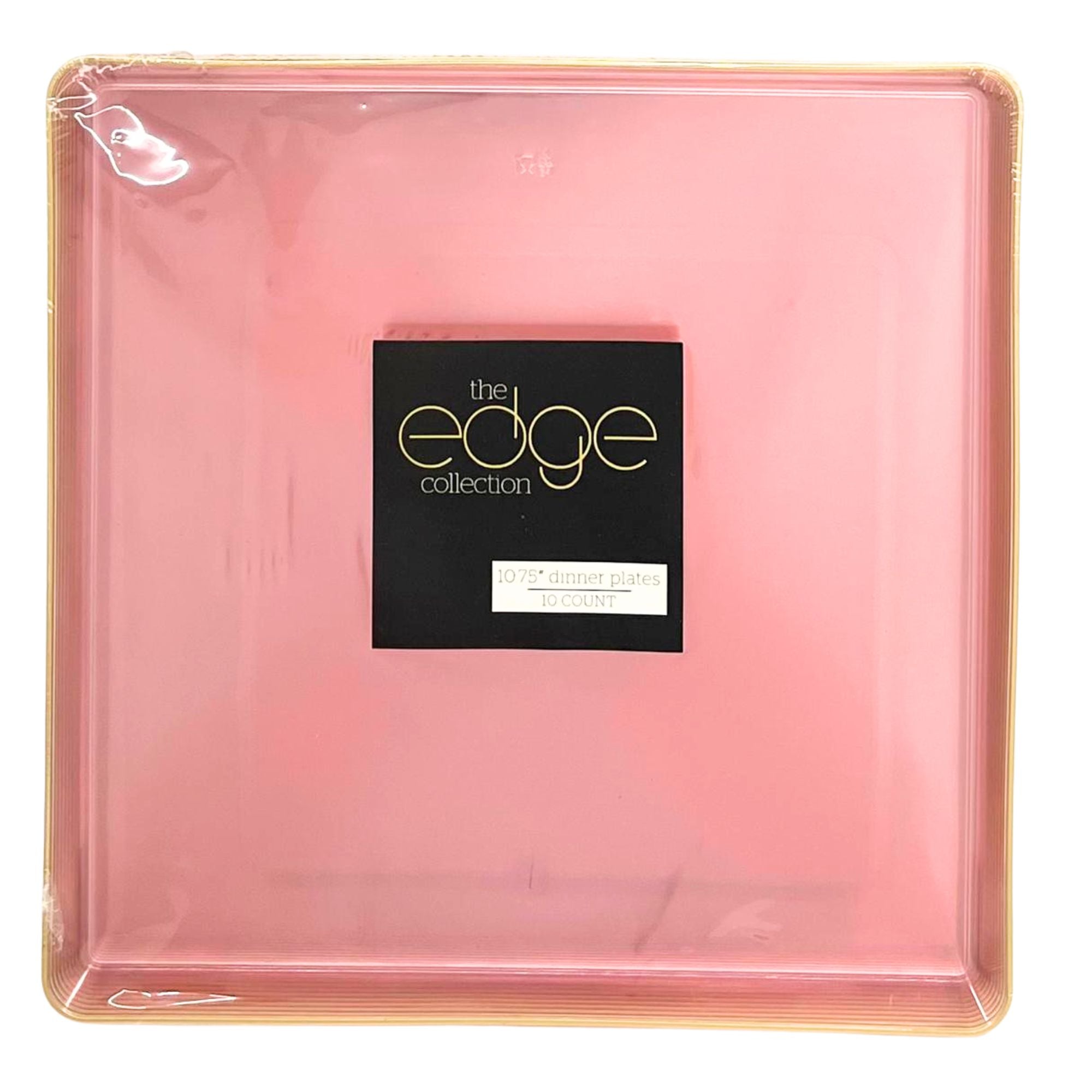 The Edge Collection 10.75" Transparent Pink with Gold Rim Square Plastic Dinner Plates
