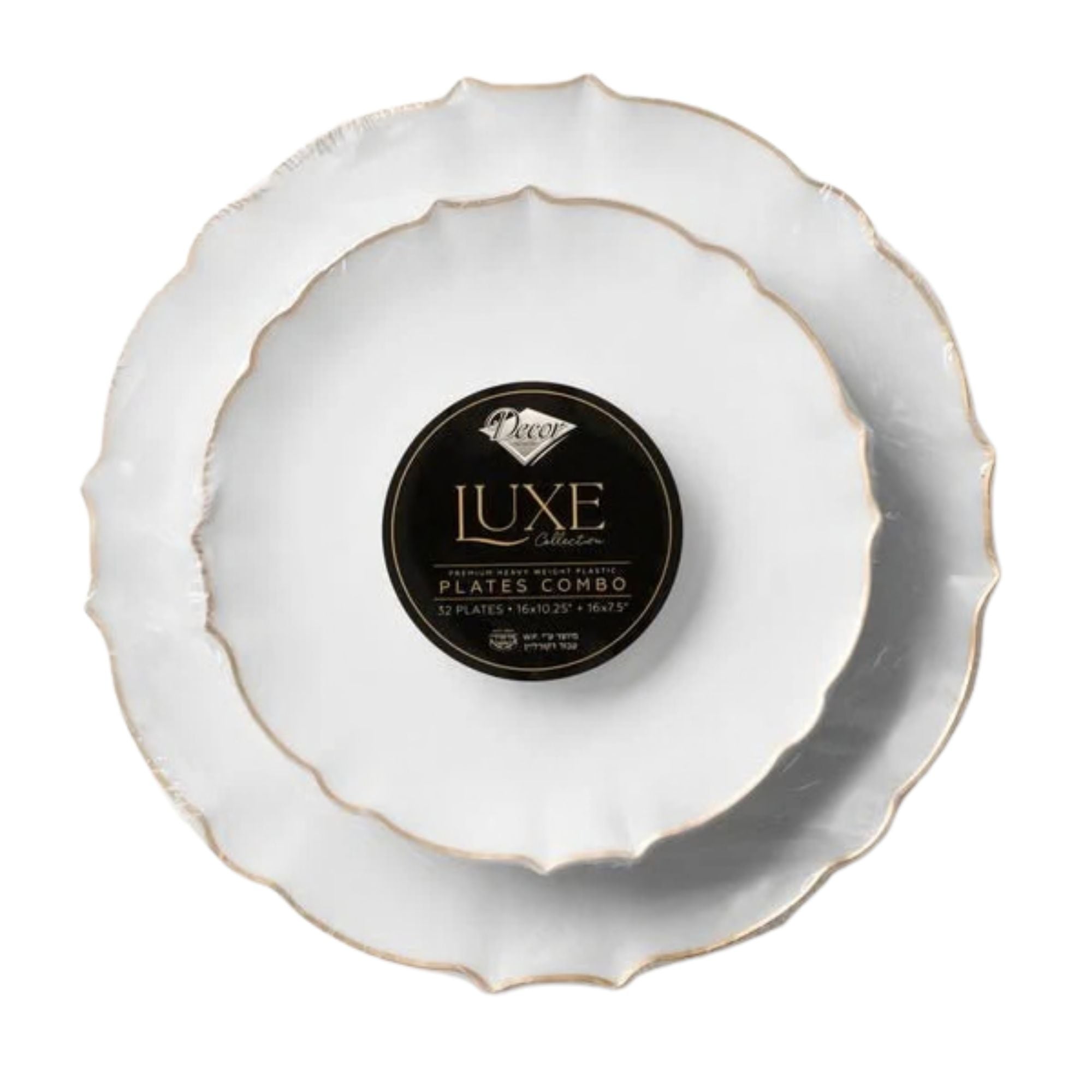 Elevate your dining experience with the COMBO SET 10.25" & 7.5" White and Gold Round Plastic Dinnerware Set – Luxe. Featuring a classic white base with a sophisticated gold trim, this set brings timeless elegance and convenience to any occasion, from casual gatherings to formal celebrations.