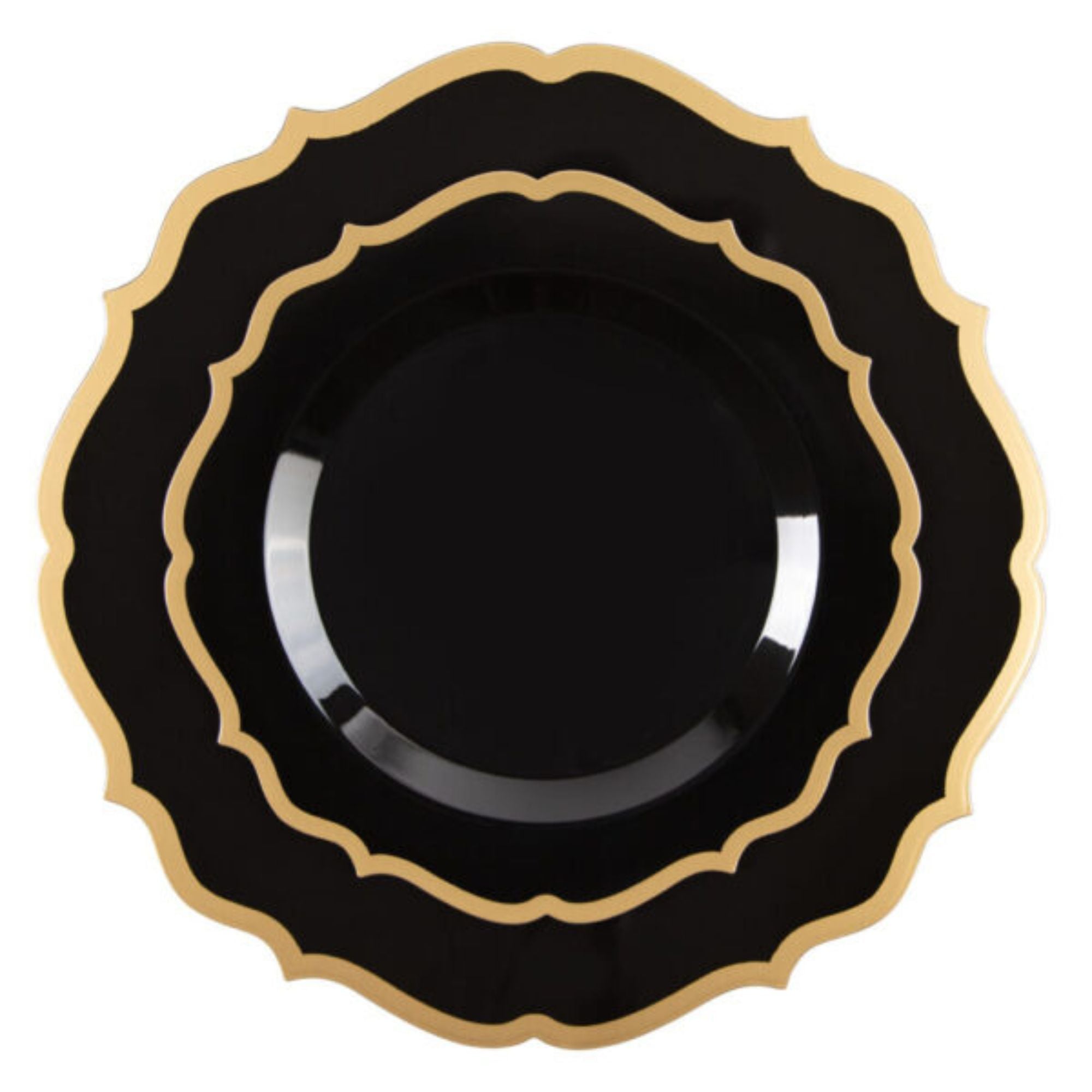 Bring a touch of sophistication to your table with the Contemporary Collection Black & Gold Disposable Plates Combo Set. Featuring a rich black finish with an elegant gold scalloped trim, these plates create a luxurious presentation perfect for weddings, parties, holidays, and special gatherings. This 32-piece set includes 16 large 10" dinner plates and 16 smaller 7" salad or dessert plates, offering a complete dining solution for your guests. Crafted from durable, heavyweight plastic, these plates provide the upscale look of fine china with the convenience of disposable tableware, making cleanup effortless after your event.