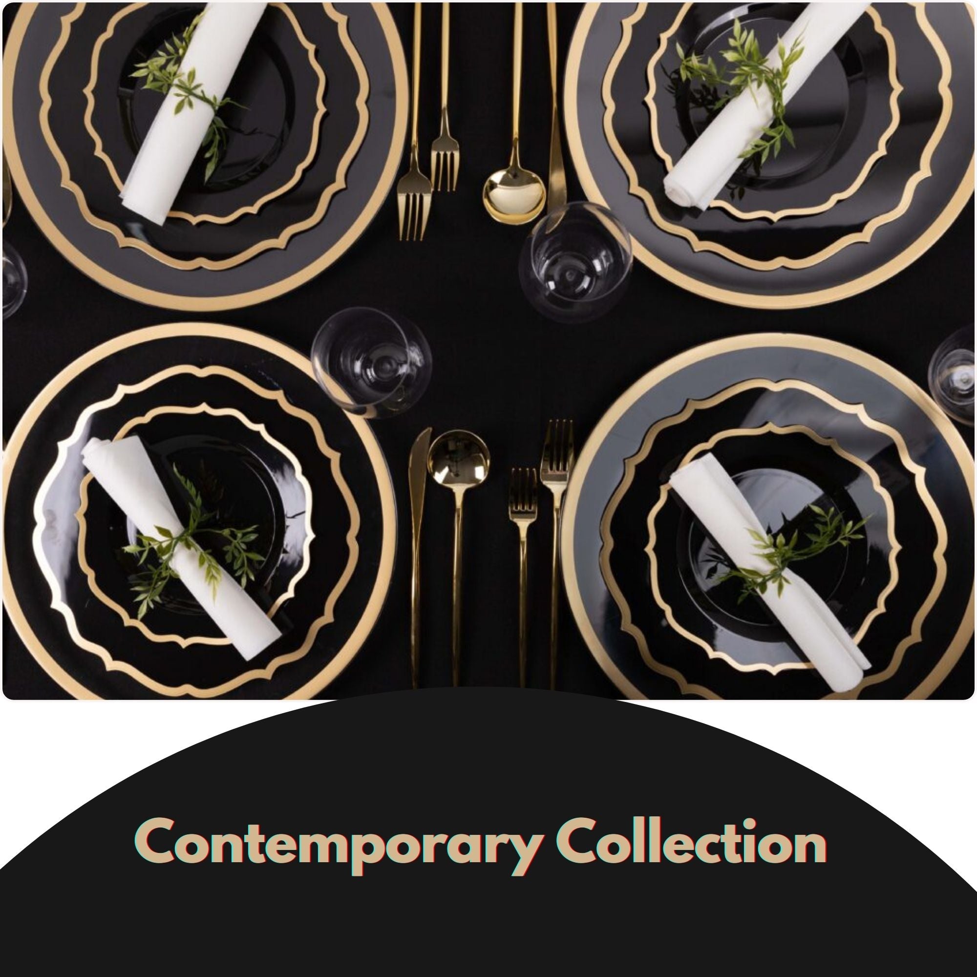 Classic black plates with refined gold trim create a premium, modern table setting that impresses guests.