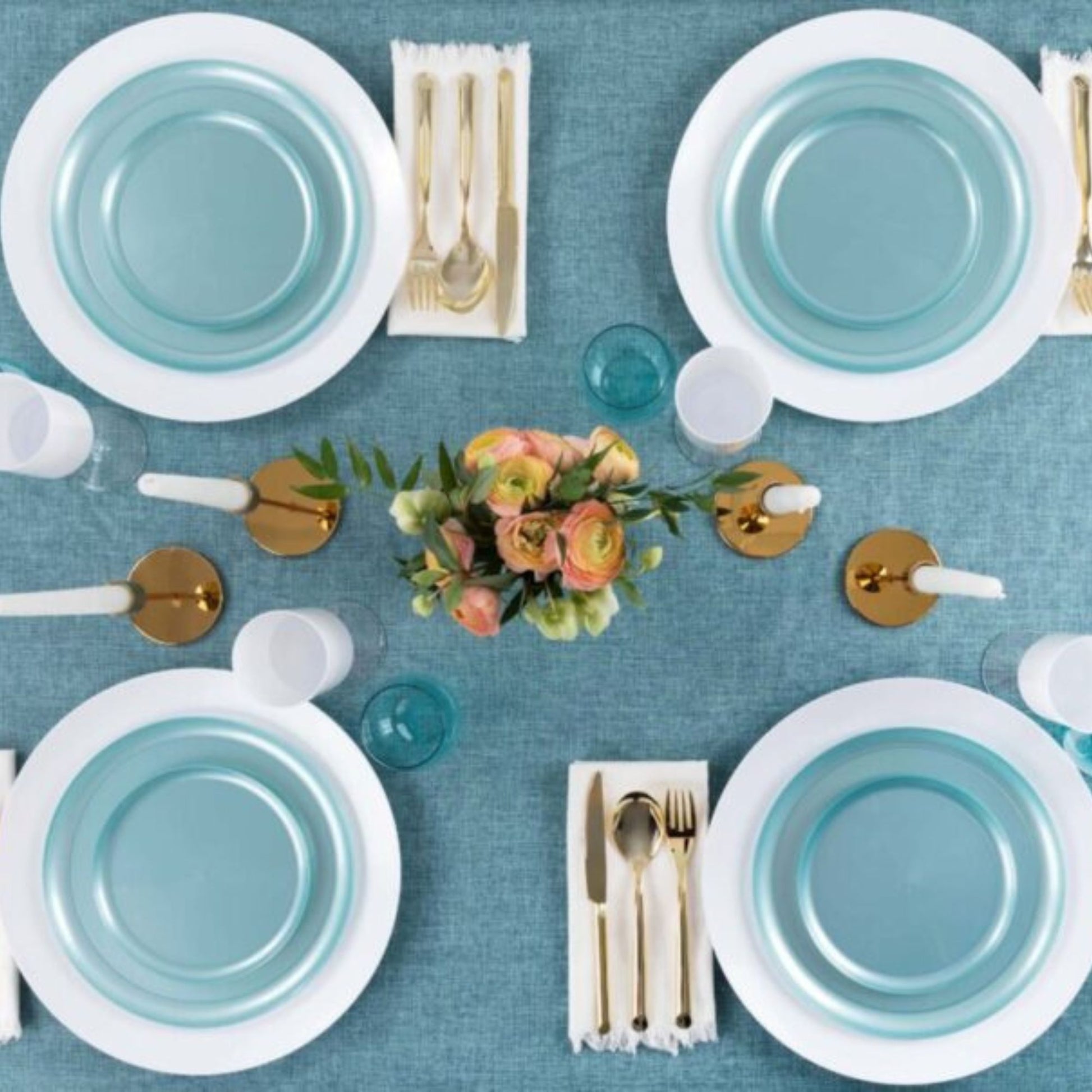 Enhance your table setting with this Teal Pearl Edge Plastic Plates Combo, designed to deliver a refined, modern look with the convenience of disposable dinnerware. Featuring an elegant teal pearlized finish and a modern edge design, these plates resemble fine china while offering dependable strength. Ideal for serving full meals and desserts, this combo set is perfect for elevating weddings, celebrations, and catered events.