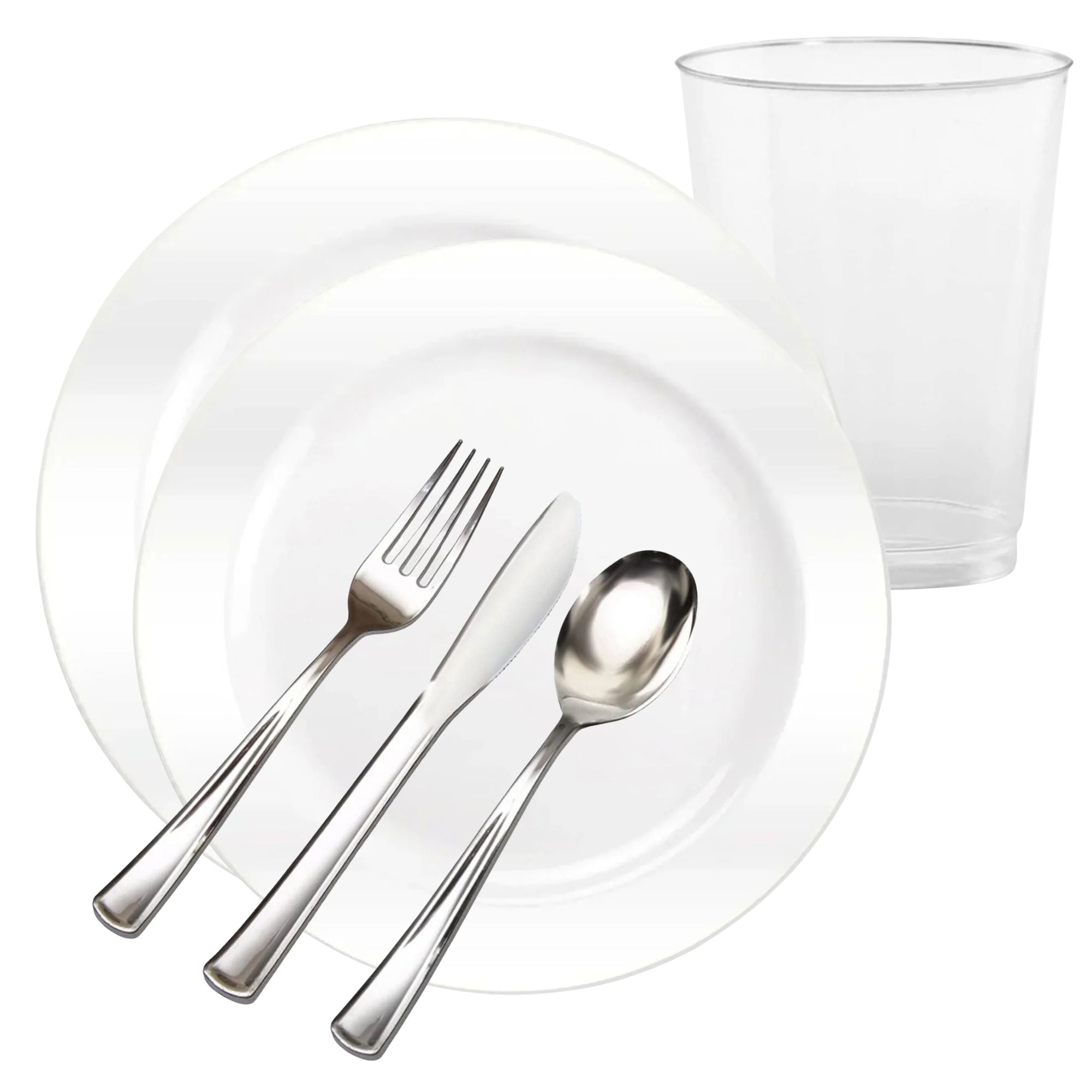 Heavyweight Pearl White Disposable Plastic Dinnerware Set- Value Pack -Magnificence