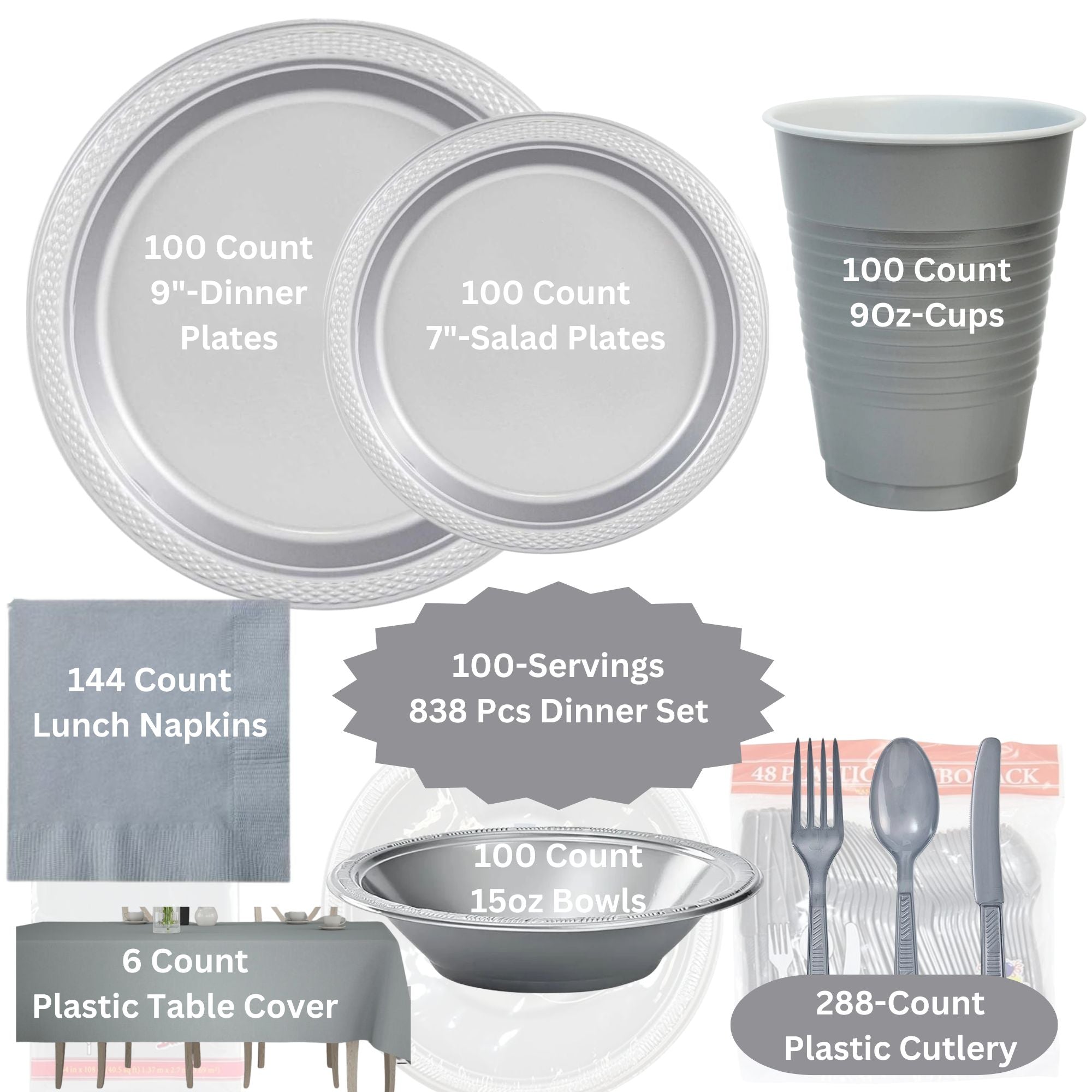 COMBO-PARTY SET: SILVER -Complete Disposable Dining Solution for Your Event