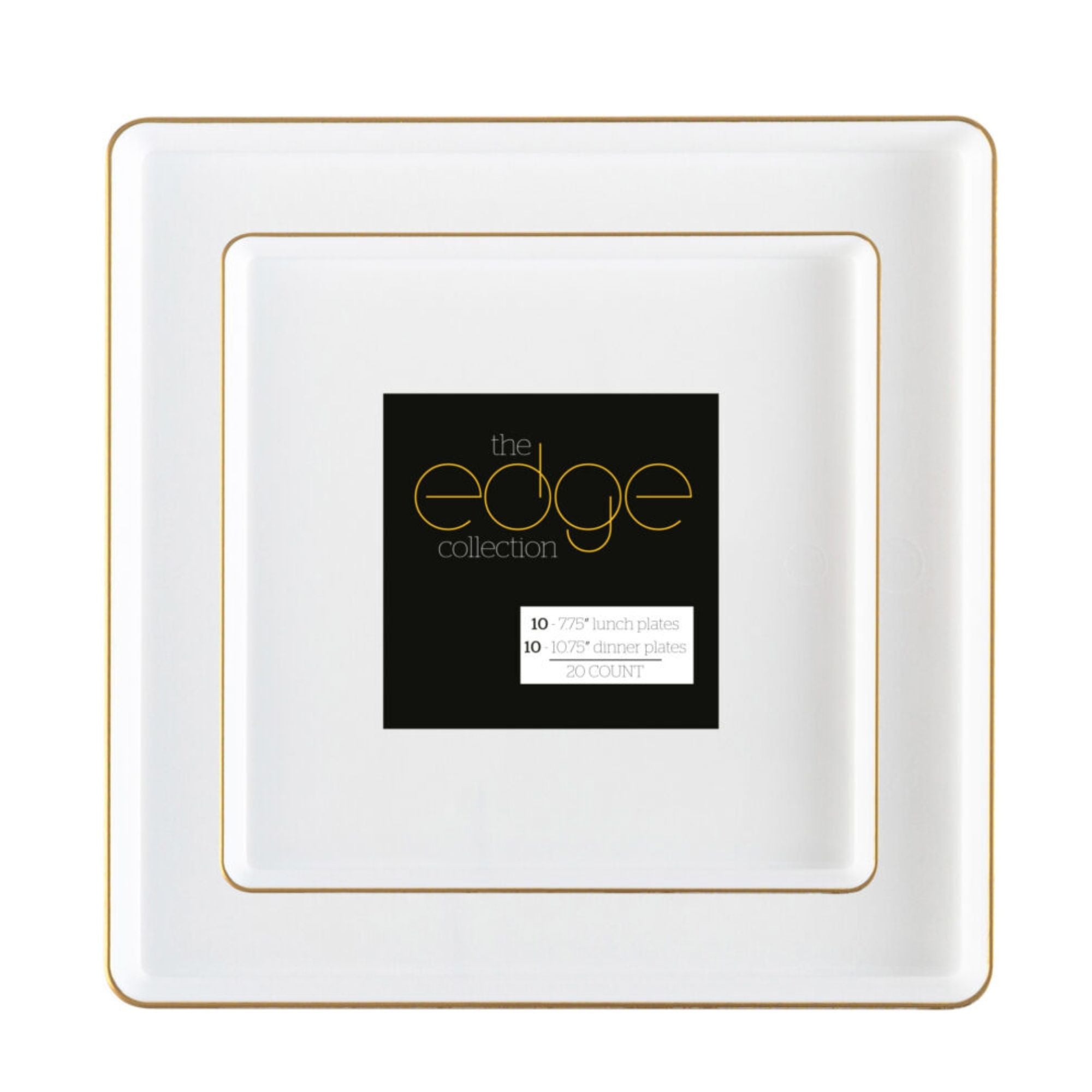COMBO SET The Edge Collection 10.75" & 7.75" Square White With Gold Rim Plastic Dinnerware